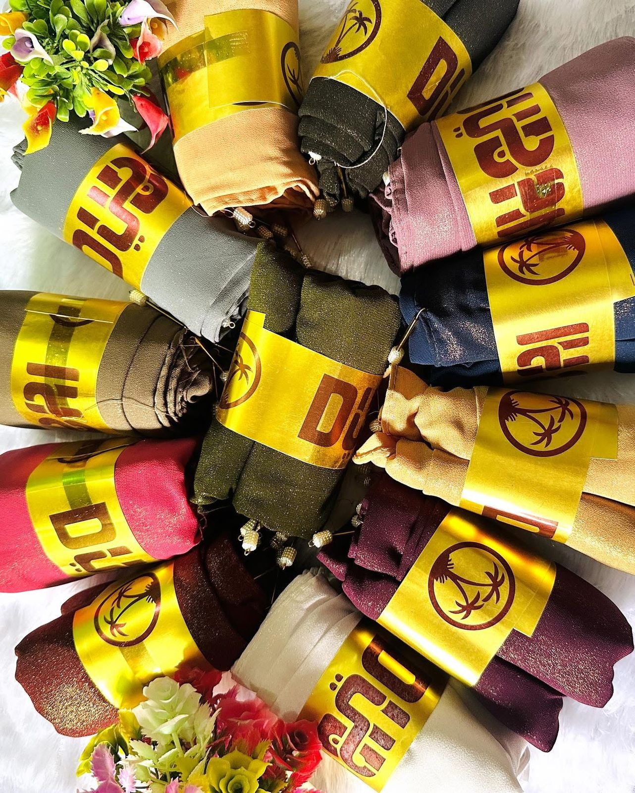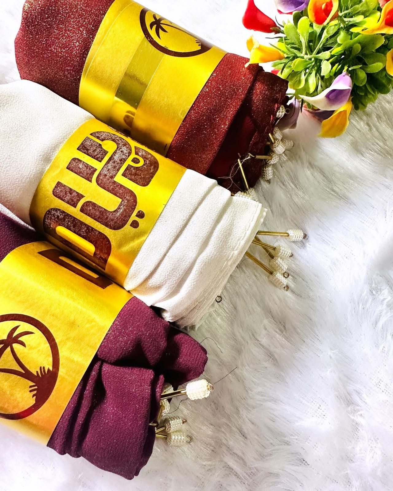 Each hijab is thoughtfully presented with an elegant gold band featuring a palm logo, making it a perfect gift. As a special touch, each hijab comes with decorative pins with pearl-like heads, allowing you to style your hijab with ease and added elegance.